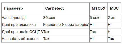 МТСБУ — для перевірки ОСЦПВ, сайт МВС — обмежені функції, CarDetect — частково безкоштовно, з розширеним доступом при оплаті.