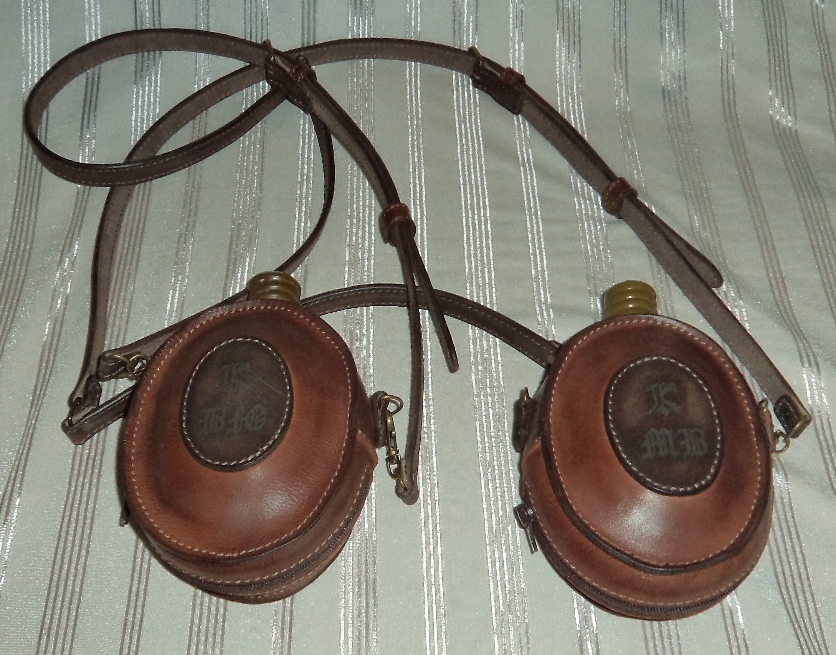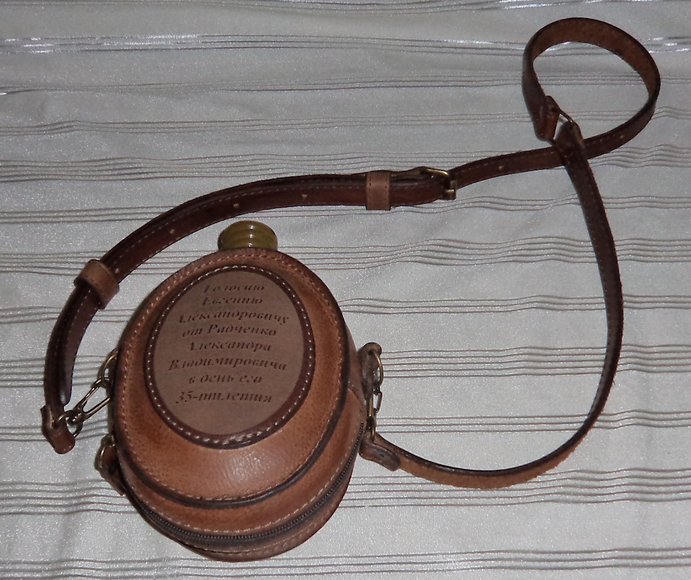 Для тех , кто много времени проводит на воздухе , фляга - необходимая вещь , а если она , к тому же , летом остается прохладной , а зимой держит тепло - это вообще здорово ! Хочу представить вам вариант чехла для фляги( прошу заметить - фляга стеклянная ) , выполняющий сразу несколько функций : и защитную , и термоизоляционную и просто для удобства. Снаружи натуральная , достаточно плотная кожа , внутри мех ( в данном случае синтетический , но это пожеланию , можно поставить любой уплотнитель ) , съемный регулируемый ремешок , подвес на пояс , позволяющий снимать и одевать флягу , не расстегивая ремня . Цвет кожи и прочие опции - по желанию клиента . В данном случае символы были предоставлены самим заказчиком .