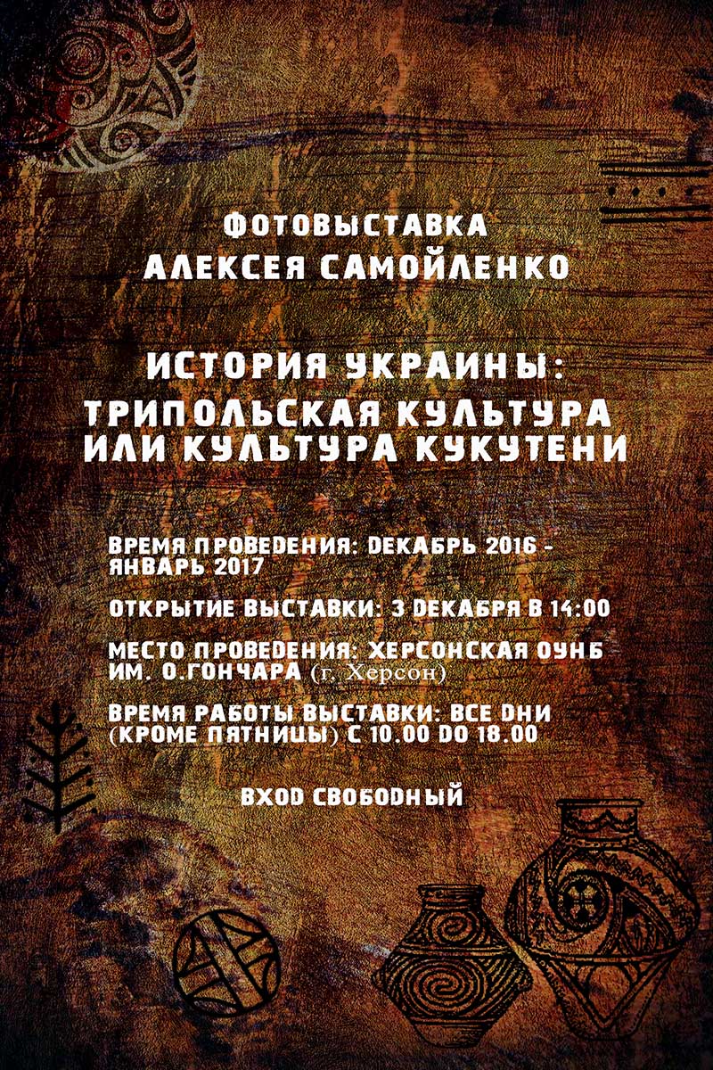 Фотовыставка «История Украины: Трипольская культура или культура Кукутени» работает каждый день (кроме пятницы) с 10:00 до 18:00 по адресу вул. Дніпропетровська, 2, Херсонская ОУНБ им. О.Гончара (г. Херсон)